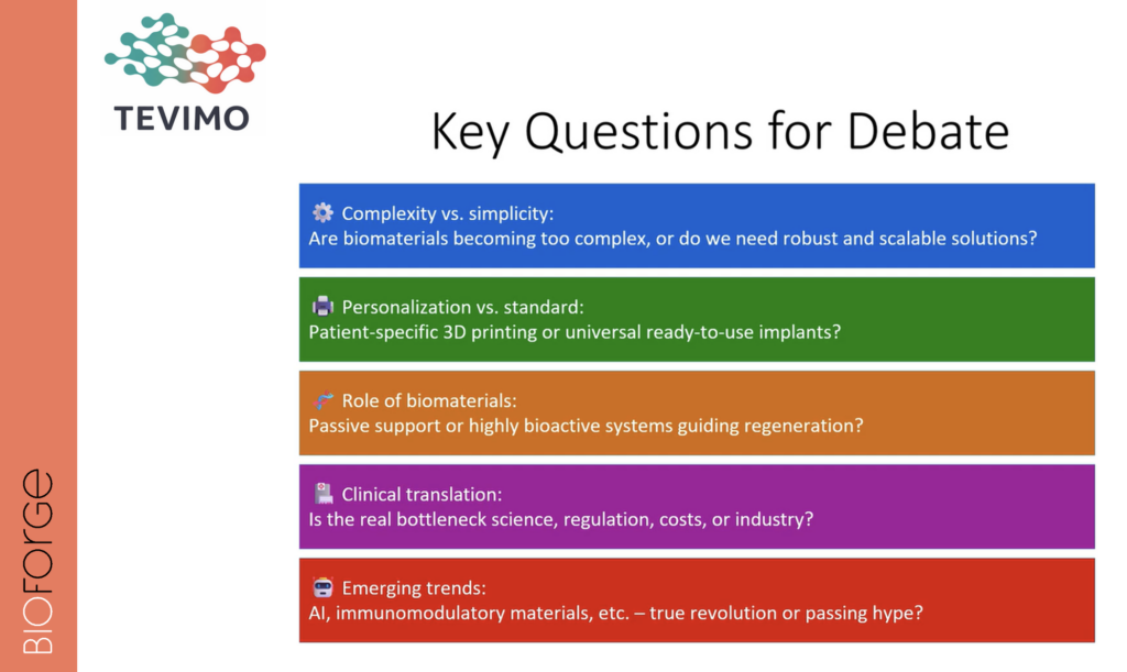 Organized in a roundtable format, this workshop brought together members of the TEVIMO network and external academic experts. The session addressed key issues related to the development of biomaterials for advanced tissue engineering applications, including the balance between material complexity and the need for robust, scalable solutions; personalization through 3D bioprinting versus universal implants; the role of biomaterials as passive supports or as bioactive systems capable of guiding regeneration; the challenges of clinical translation, including scientific, regulatory, economic, and industrial factors; and emerging trends such as artificial intelligence-assisted design and immunomodulatory materials.